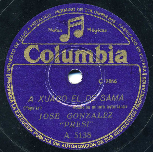 What I do know is this: Jose Gonzalez, nicknamed “El Presi” (1908-1983), was one of the most renowned early tonada singers and began his career in the late-20s/early-30s, making several hundred recordings. As with most good regional music on 78, good luck finding those! Gonzalez, in this piece, is accompanied by a subdued guitar, and the song appears to be a lament for the death of another great tonada singer, Xuacu’l de Sama, who died in 1935 (note the northern Spanish pronunciation of the letter ‘x’ as ‘zh’).