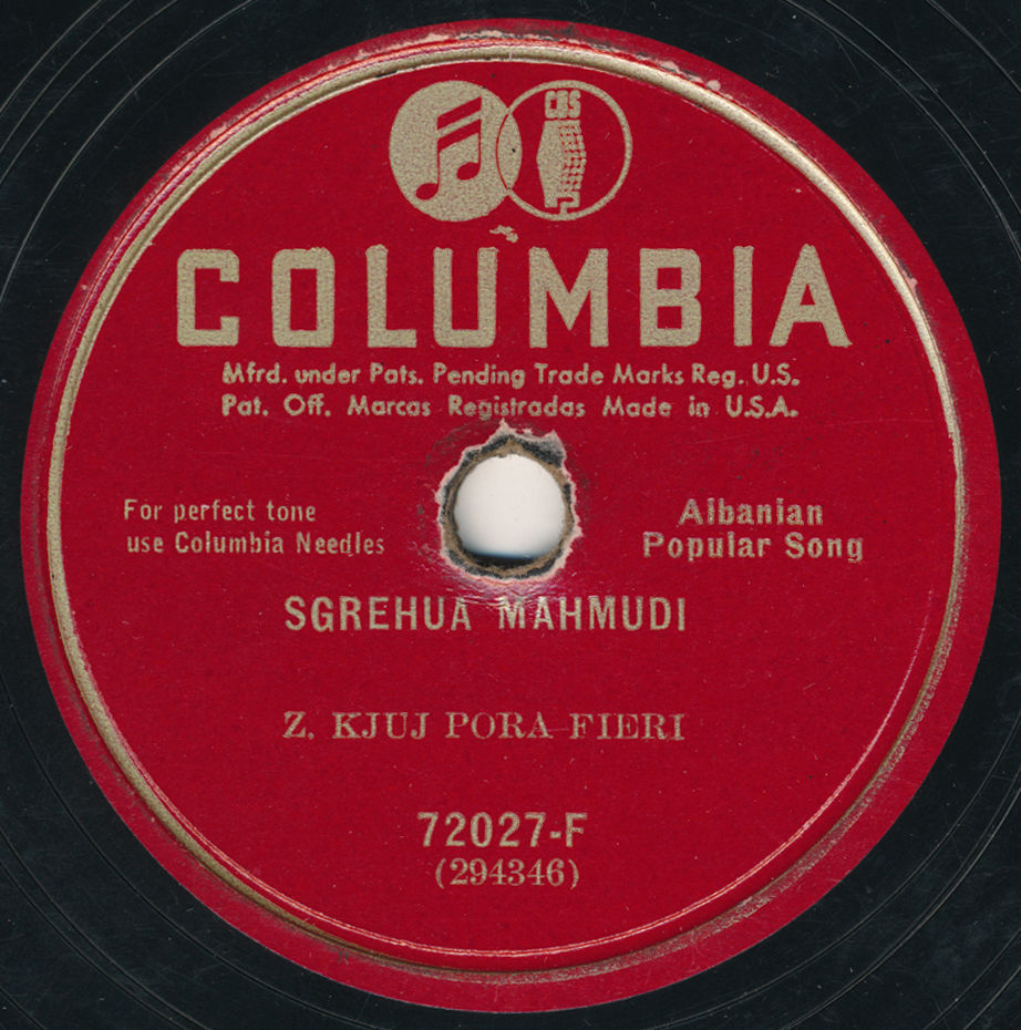 A year before the Gramophone Company recorded in Tirana and Shkoder, the Columbia Graphophone Company made nearly 300 recordings in Shkoder in November 1929, and had already recorded numerous Albanian discs in Istanbul earlier that year. Some of these records – a total of 49 to be exact – were pressed in very small amounts in the United States, specifically for the Albanian immigrant population (in 1920, the Albanian-speaking population of the United States numbered a mere 6,000). They were “dubbed” from 10″ discs onto new 12″ masters, in an attempt to charge more money for them – a not-so-uncommon practice, unfortunately, as the sound quality lessens during this process, and it appears to be a crass attempt to gauge more money out of immigrant buyers, who might place more importance on these larger discs. This is one of those.