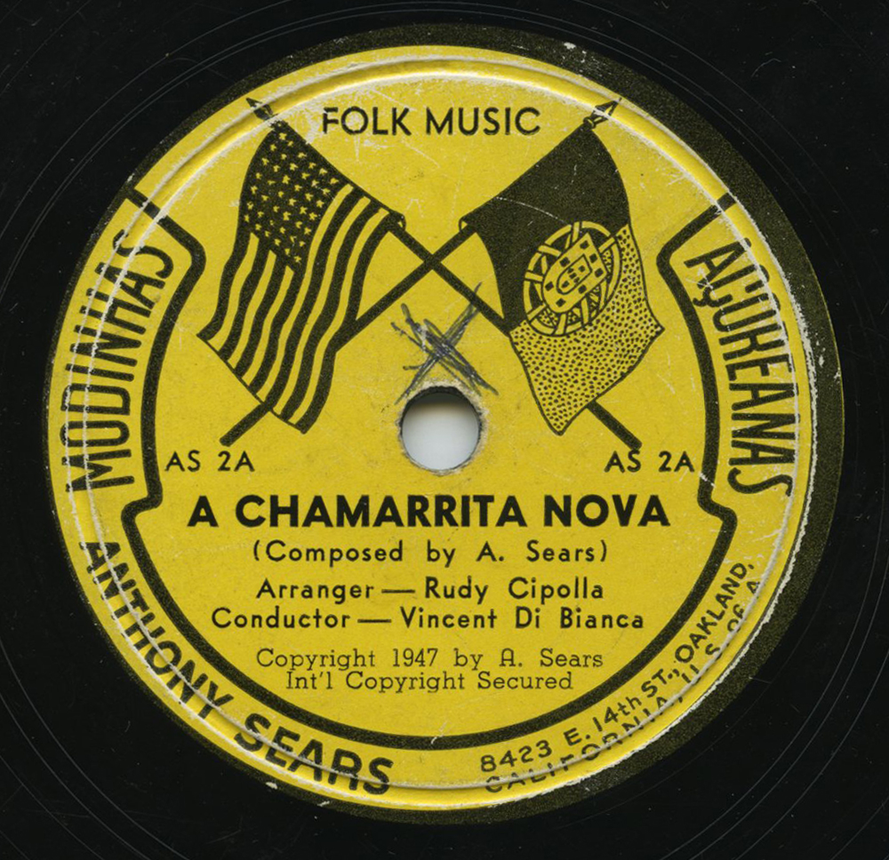 sears2An interesting wrinkle has appeared regarding the Anthony Sears saga. I discovered that Anthony Sears issued a second series of Azorean 78s on his label. For this series, it appears that he went with both professional musicians as well as a better pressing plant (the pressings on this series don’t have any pressing errors nor are they brittle, as the others are). The musician credited as the arranger of these tunes is none other than Rudy Cipolla, a well-known Bay Area mandolin player with a lengthy career, and who eventually recorded for Rounder Records. A Berkeley-based violinist named Vincent di Bianca is also credited as the conductor. Anthony A. Sears is credited as the composer for these tracks. Most importantly, there’s a date: 1947.