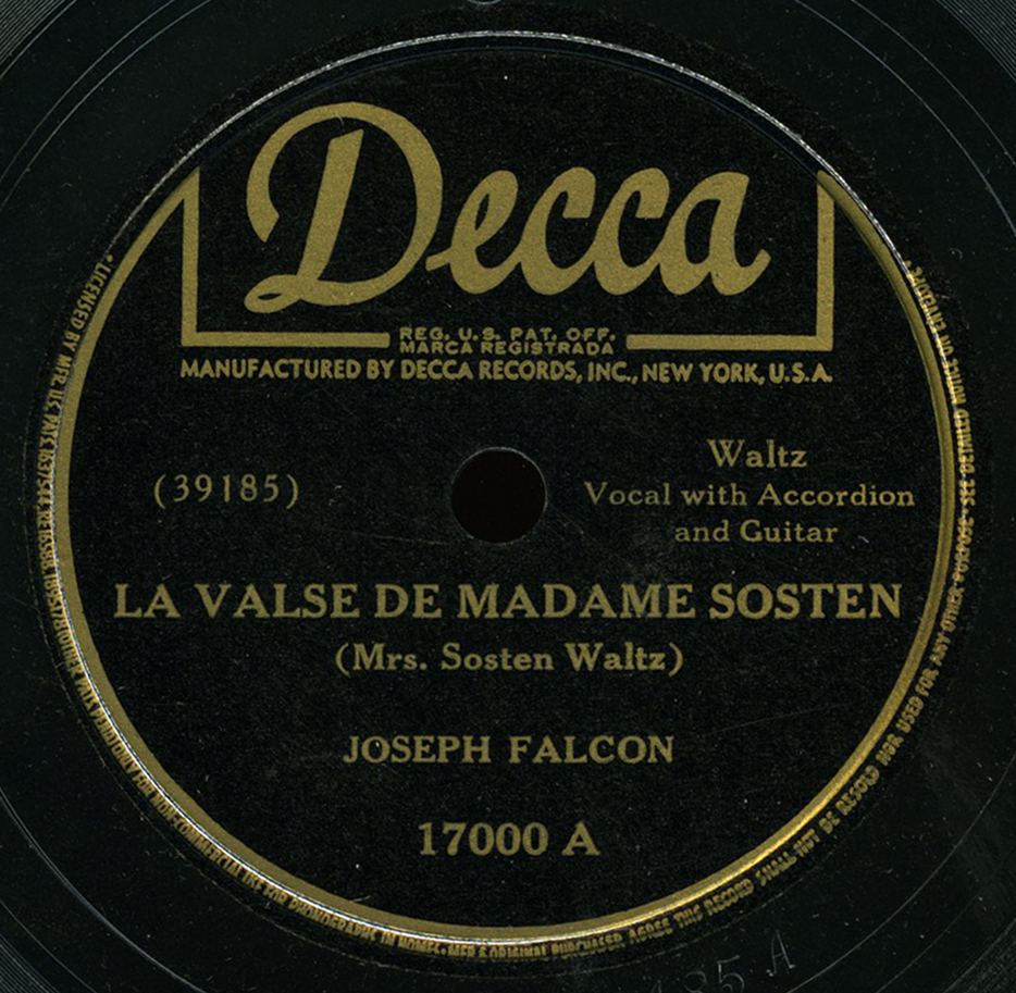 This track, the name of which is commonly spelled “Sosten,” “Sosthene” or “Sothene,” is a waltz in G-sharp played on a C-sharp accordion, and was recorded in New Orleans on December 22, 1934. This was the Falcon’s very first song recorded for their first session for Decca Records. It has since been covered by many contemporary Cajun artists such as Michel Doucet and Wayne Thibodeaux. Lyrics for this song are online, but they are not quite the same as Falcon’s version, although Falcon’s version does begin with the standard line: Oh, Madame Sosthene, mais donnez moi Alida; cette la j’ai aime depuis l’age de quatorze ans (Oh, Madame Sosthene, give Alida to me; the one I’ve loved since the age 14). The Falcons would record 40 songs for Decca over the next 3 years.