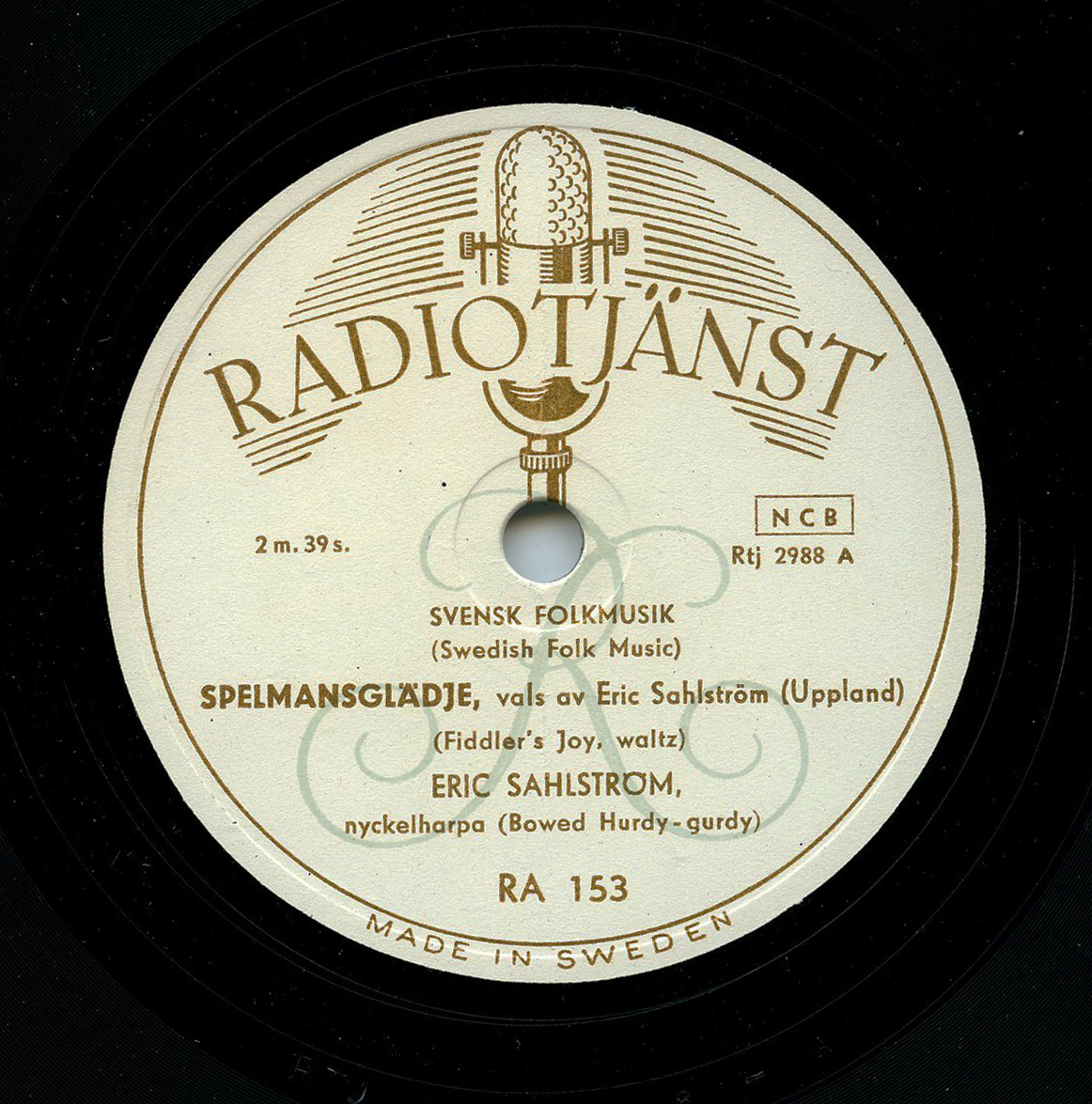 Flash forward nearly 40 years. Apart from the scarce early examples, one of the most interesting series containing folkloric music on 78 from Sweden were the occasional discs issued by the Radiotjänst label, run by the Swedish national broadcast company. While most of their releases on 78 were classical, from about 1946 or so, Radiotjänst periodically recorded excellent folk music by the most renowned traditional musicians in the country. Only several dozen of these discs were issued and those don’t exactly grow on trees either, but they constitute a wide array of top performances. Probably the most well-known nyckelharpa musician of the 20th century, Eric Sahlström, was among those captured – on a mere 2 discs, in 1950.
