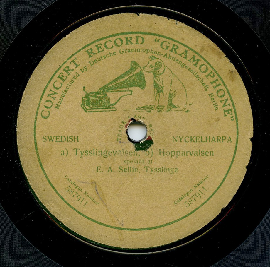 It is Tysslinge where Erik August Sellin was from. Born in 1869, Sellin was actually a multi-instrumentalist, playing besides the nyckelharpa, the clarinet, accordion, and violin. He lived portions of his life in Stockholm, with travel to the U.S. and to Berlin as a touring musician, though apparently the tours were not as successful as he’d hoped. He did, however, record several nascent examples of nyckelharpa folk music for Odeon, and for the Gramophone Company, in 1912 and 1913, respectively. This piece (link below), recorded in Stockholm on August 12, 1913, is a medley of two tunes, “Tysslingevalsen” (Waltz from Tysslinge) and “Hopparvalsen” (Jumping Waltz). Bowed instruments can sound so distant on these early recordings, even in perfect condition. I am sure well-seasoned Excavated Shellac readers have the innate ability to hear magic through the fog.