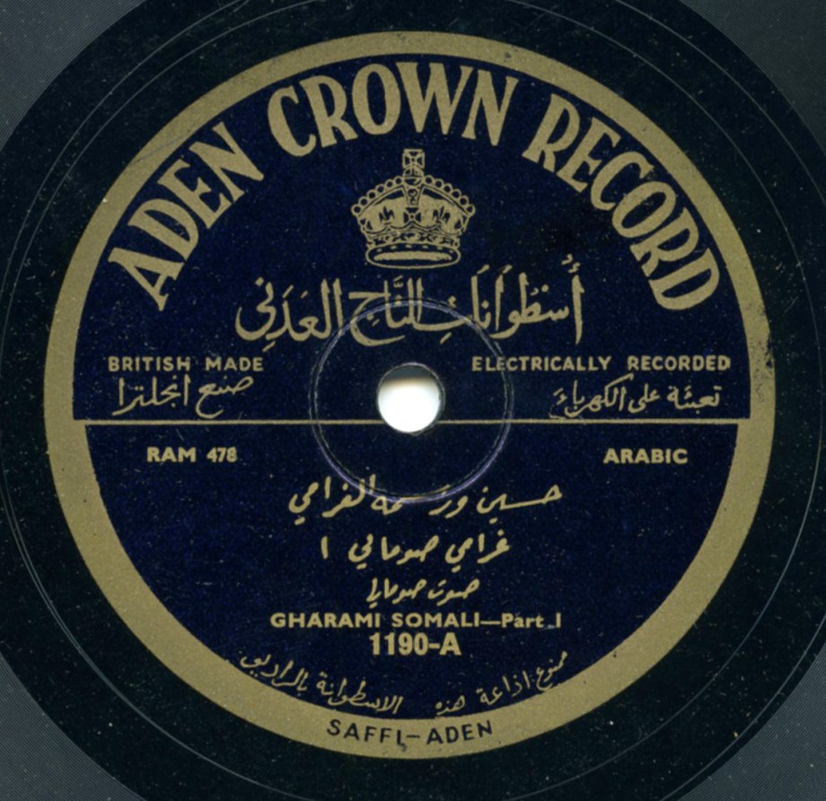 Aden Crown was a label that was founded ca. 1937 probably right after Odeon had ceased recording in Aden. They were active in the run-up to World War II, and then immediately after the War. Founded by Ali bin Abdullah al-Saffi and his brothers, Aden Crown issued approximately 190 78s which were pressed by Decca in London. Out of those, at least four were in the Somali language. The known performers were Muhammad Hasan al-Barbarawi, Ahmed Harush, Muhammad Kahin Ishaq, and the performer featured on the disc at the top of this post, Hussein Warsima al-Gharami. Likely recorded just after World War II, the music is listed as saut Somali, indicating the popular music of the Gulf, saut, which features oud, violin, and mirwas drum.