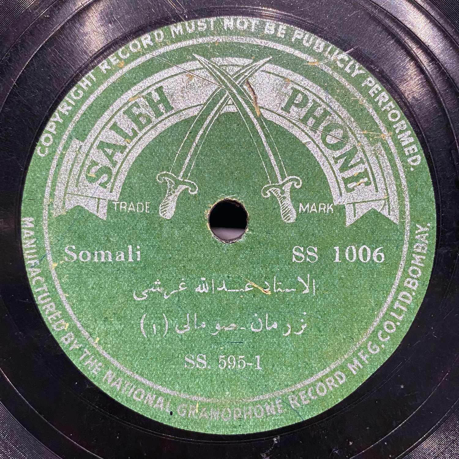 After World War II, independent label owners and performers from the Persian Gulf region and the Arabian Peninsula sometimes turned to Mumbai for both recording and pressing discs. This could be, according to scholar Ahmad Al-Salhi, due to the fact that there was a Gulf community in Mumbai, and there was an independent pressing plant there (owned by The National Gramophone Company, whose primary label was Young India) that would clearly produce short runs of 78s for small entrepreneurs, outside of the grip of the EMI mega-conglomerate and their pressing plants. One of these small labels was Saleh Phone, who issued two known Somali 78s by Abdullah Gharshi and Edapai Medban Uoronehi. Additionally, there may have been a connection between Saleh Phone and Salimphone, the label owned by Omani singer and performer Salem Rashed al-Suri. Two additional Somali 78s appeared on al-Suri’s label Salimphone, performed by Mahmud Ismail Hadidi and Anisa Amma Muhammad. Both of these Salimphone discs have “Salehphone” written on their labels. Were they originally issued on Saleh Phone and recorded in Mumbai? This was not a completely uncommon practice. Some discs from the Gulf were re-pressed by other labels that were usurped by other labels, etc.