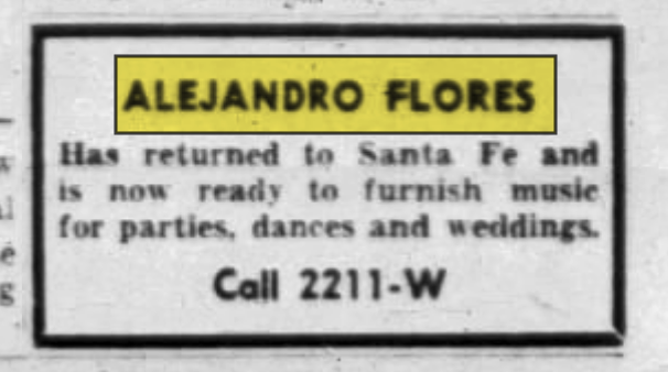 Alejandro Flores was active locally in Santa Fe with his “dance orchestra” that consisted of Ortiz on mandolin, Tony G. Chavez (violin), Henry Ortega (guitar), and Evaristo Lucero (guitar). They played a variety of dances, weddings, and other events. Ignacio Ortiz had his own band and was active prior to WWII, leading a group called Los Nativos.