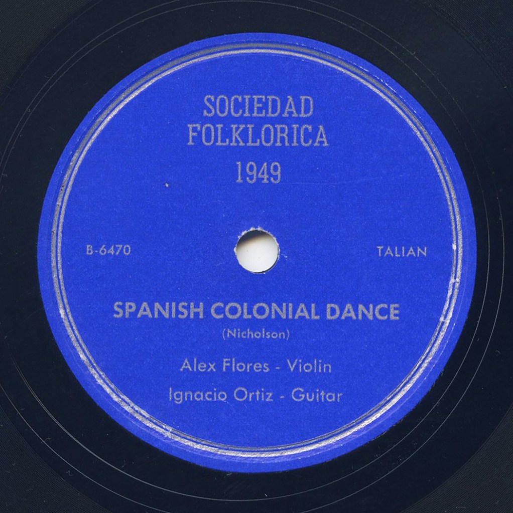 The group also produced two 12” discs with all four sides labeled as “Spanish Colonial Dance,” performed by Alejandro “Alex” Flores on violin and Ignacio Ortiz on guitar. I suspect the 12” format was preferred so the dances could be extended as long as possible, as each side is about four minutes long. The records appear to have been available only through the “music committee” of the Society and through word of mouth, and were first mentioned in late October of 1949 in the local newspaper. This is the only copy I’ve come across, and it features both an indita, a broad song descriptor that indicates a connectivity between Native Americans and “Hispanos”; and a taleán (or “talian” on the label – and there’s some indication that the song type may be Italian in origin), sometimes called a “weaving dance.” (The second disc features a cuna and a paso doble.)