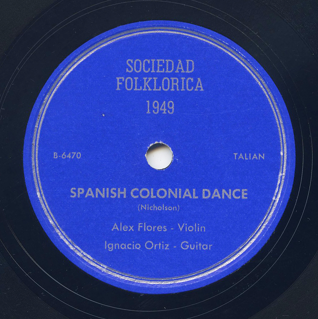 The group also produced two 12” discs with all four sides labeled as “Spanish Colonial Dance,” performed by Alejandro “Alex” Flores on violin and Ignacio Ortiz on guitar. I suspect the 12” format was preferred so the dances could be extended as long as possible, as each side is about four minutes long. The records appear to have been available only through the “music committee” of the Society and through word of mouth, and were first mentioned in late October of 1949 in the local newspaper. This is the only copy I’ve come across, and it features both an indita, a broad song descriptor that indicates a connectivity between Native Americans and “Hispanos”; and a taleán (or “talian” on the label – and there’s some indication that the song type may be Italian in origin), sometimes called a “weaving dance.” (The second disc features a cuna and a paso doble.)
