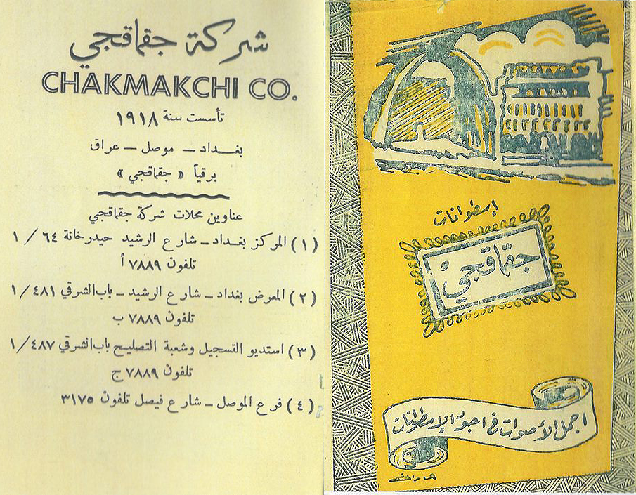 Meanwhile, Haj Fathi’s third son Sami opened yet another branch of the family business in 1951 at the entrance of Al-Rasheed Street in Baghdad. This became the famed Chakmakchi shop in Iraq. Haj Fathi and Sami were in charge of the record production side of the business, in addition to building relationships with Arab artists such as: Um Kulthum, Mohammed Abdul Wahab, Abdul Halim Hafez, Muharram Fouad, Sabah, and Faiza Ahmed; with Iraqi artists, such as Al-Ghazali, Hudayri Abu Aziz, Zohour Hussein, and Salima Murad; and with Kurdish singers like Muhammed Aref Jazrawi, Hassan Jazrawi, Taher Tawfiq, and many others.