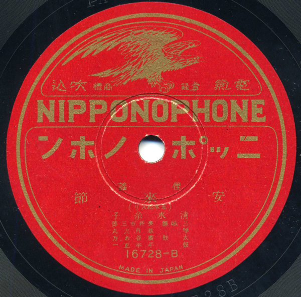 This is another example of how commercial 78s were everywhere, even in what might be considered to be rural, hard to reach communities. This was the case of a smaller, local record company providing Okinawan music for both Okinawans, and the Okinawan diaspora. Okinawan or Ryukyuan folk music performed by actual Okinawan musicians seems to have been only occasionally recorded during the 78rpm era. The first label that was active was named Marufuku and was established in 1927 in Osaka, a city which at the time held a large amount of Okinawan immigrants. Their pressings were made by the Taihei label. Confusingly, the Marufuku disc essentially looks like a Taihei release…except for the kanji for “Okinawa” underneath the word “Taihei.” There was also Marutaka which was established in 1955 by Okinawan businessmen Koura Jiro and Jira Takara, who owned the Takara Watch Store on Helwa Street in Naha City in Okinawa. It was, at least at first, a subsidiary of Victor in Japan, who pressed the records. This piece was issued on Marutaka ca. mid-1957.