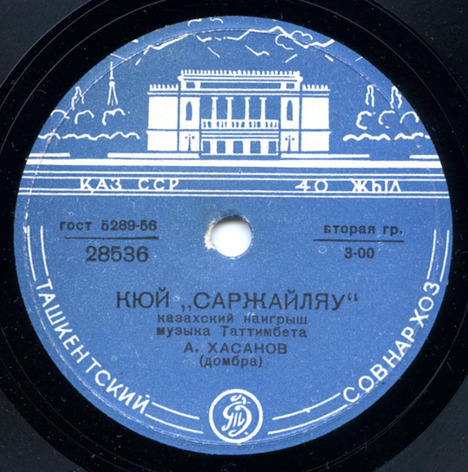 Tättimbet died in 1862. Like all kuis, his works are passed down through oral tradition and memorized. In the Soviet era, Kazakh music fared quite well, despite the records’ scarcity today. Kazakh music on disc was certainly dwarfed by music from Russia proper, with its thousands of popular, classical, and nationalist recordings. However, compared to other musics by non-Russian cultures in the USSR, the availability of Kazakh music was overwhelmed only by the number of Uzbek discs available. Pekka Gronow has documented that in the 1960s, when the Soviet Union was still pressing 78s, well over 400 Uzbek discs were readily available. For Kazakh records, that number was nearly 300. This was a considerable figure, despite the fact that many of these 78s were likely nationalistic. It’s also a considerable figure when you compare that number to the relatively small number of available Azeri discs, 95 in total, when the Azeri and Kazakh populations were not wildly far apart at the time.