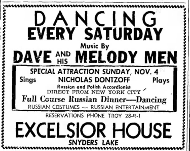 Dontzoff accompanied his wife Lucy on four discs in 1929, and one disc accompanying Lucy and then-famed Russian “gypsy” singer Vera Smirnova. Then things go dark. He and Lucy were divorced by 1935. Nikolay moved downtown to the Eastern European neighborhood in the East Village. He was still performing both as a solo act, and with Russian music and dance troupes, often touring the country. He performed in the Russian revue Chauve Souris on Broadway, which ran for twelve performances in 1943.