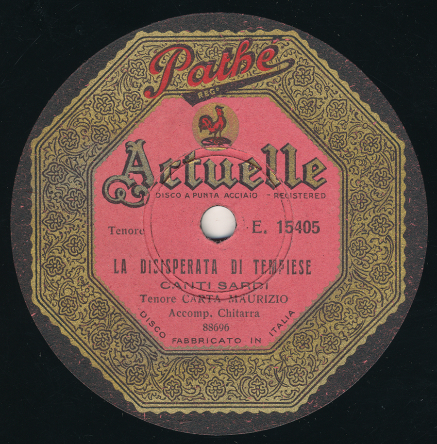 The story goes that in 1928, an executive from the French Pathé company heard the voice of Maurizio Carta, and immediately signed him to a record for the label. This record was probably made not long after. Carta was born in 1904 to a middle-class family in Mogoro, a town in the Sardinian province of Oristano. He later gained fame with his recordings on Pathé. He is, in fact, not forgotten, as a choir named for him, the “Coro Maurizio Carta,” is active today. The term “disisperata” is used on both sides of this disc. Canto e chiterra songs have been divided into 12 different types, and the “disisperata” is usually the 12th and final song. “Tempiese” could be referring to a type of canto a chiterra singing known as La Tempiesina, which comes from the town of Tempio Pausania in the Gallura region. As always, I await your contributions and knowledge. For now, a Sardinian bagatelle…