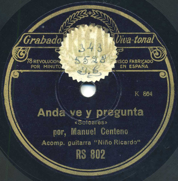Manuel Centeno was considered to be one of the last great masters of cante grande, particularly by writer D.E. Pohren, whose 1960s books “The Art of Flamenco” and “The Lives and Legends of Flamenco” pull no punches in excoriating those he feels injured the classic art. Pohren gives Centeno’s date of birth as ca. 1900, but a 1966 text in Spanish gives his birthdate as 1885, in Seville (another website gives his birthplace in Murcia). He died in 1960, apparently impoverished. This piece was originally recorded for Columbia ca. August 1928, possibly in Barcelona, and released on their Regal imprint, though Centeno also recorded for HMV in 1929. On HMV’s sessions, Centeno was accompanied by the great Ramón Montoya (uncle of Carlos). On this session he is accompanied by another guitarist of reknown, and also, along with Montoya, one of the few guitarists who accompanied the great La Niña de los Peines throughout her career, the aforementioned Niño Ricardo. Ricardo (1904-1972), born Manuel Serrapi Sánchez in Seville, accompanied all manner of flamenco greats, and even went commercial for a brief period, much to the chagrin of some purists (there were songs like “Flamenco Twist” being performed in the 1950s, by performers who previously practiced more traditional flamenco forms). Regardless, he has always been considered an absolute master. I hope you enjoy the piece, whose translated title means “Go ahead and ask.”