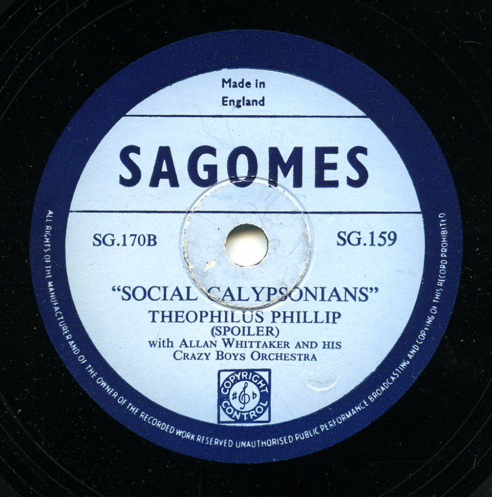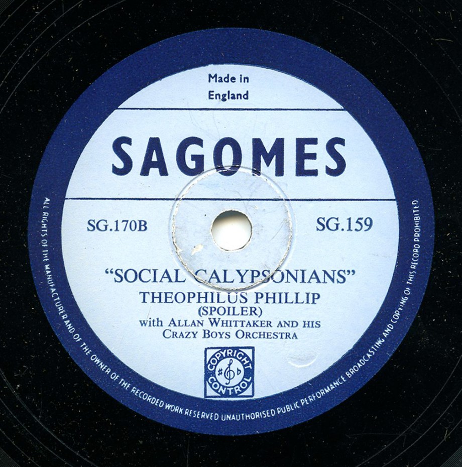 The song at hand was released the same year on the local Sagomes label. The label had its own recording studio in Port of Spain and was managed by Eduardo Sa Gomes, a music store owner and former agent for U.S.-based record companies such as Decca and RCA, who had recorded and issued an impressive number of Trinidadian calypsos during the previous decades. The track is a rare piece. It hasn’t surfaced on any reissues so far, nor been referred to in any books I’ve read on calypso history. Melodically, the general listener may find it somewhat simple and formulaic. The purported craziness of Allan Whittaker’s orchestra may seem to have been subdued a notch or two in this session. In fact, their honks and beats are barely audible, apart from in between verses. My guess is that this is not due to sloppy arrangement or amateurishness on the part of the engineer. Sure, the recording equipment was rather basic and the whole band had to share a single channel with Spoiler, but more importantly, when orchestras played with calypsonians they were in all essence backing bands. There was simply no tradition – and hardly enough grooves on the shellacs – to have a horn-man break away into a 10-plus-bars solo. So the audience wasn’t expecting any of that. What they did expect, though, was fresh, funny lyrics and a good story. Thanks to the balance chosen between singer and orchestra, Spoiler’s words are fully decipherable and enjoyable, even to a foreign ear (at least a calypso-friendly one, as mine) 63 years later. So let’s have a listen to the first two verses of “Social Calypsonians”: