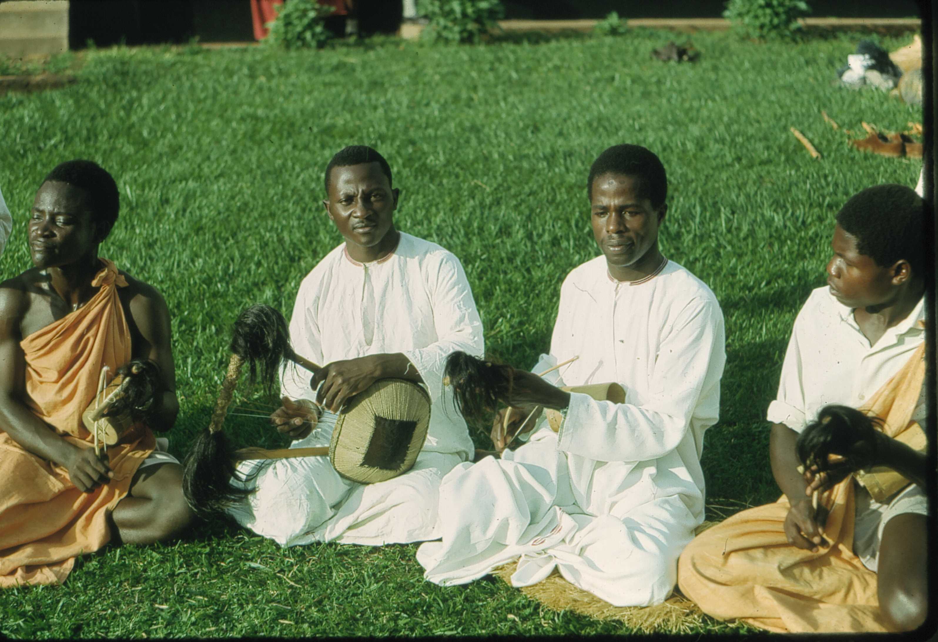 Above: A group of musicians from Kyambogo National Teachers’ College, ca. 1967-1968. The endongo player is Bulasio Busuulwa, and the ndingidi player to his left is Christopher Kizza. (Photo by Peter Cooke.)